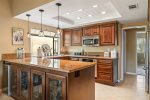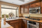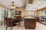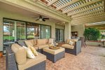Inside, the home features a spacious, open-concept layout with modern desert decor and everything you need for a relaxing stay. The living area is bright and inviting, with plush seating, a large smart TV, and direct access to the patio. The fully equipped kitchen includes updated appliances, granite countertops, and all the essentials for cooking at home—or simply enjoy takeout from the on-site restaurant, The Roadrunner, just a short stroll away.