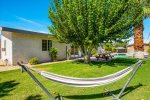 Backyard is complete with dining area, a hammock, and a fun grassy area for kids to play.