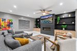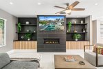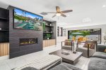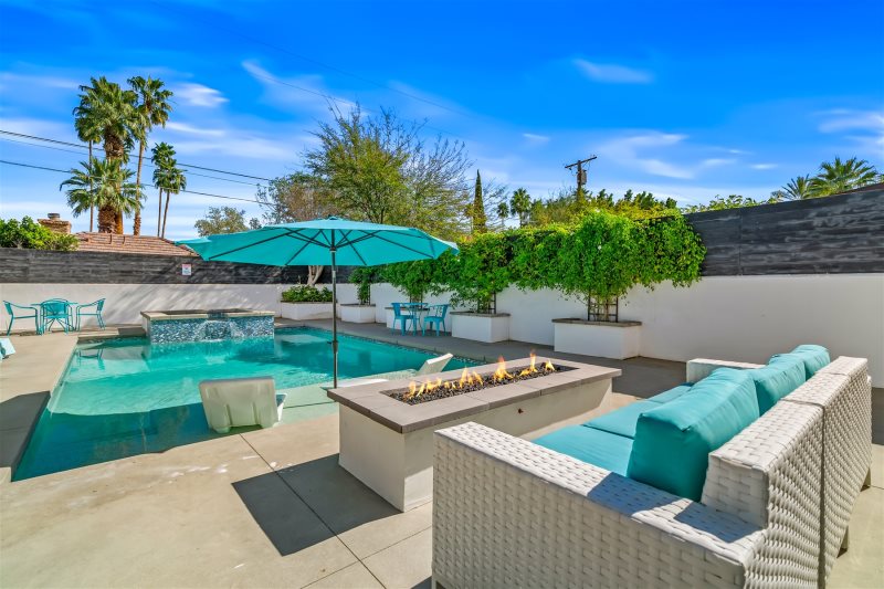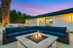 Outside, breathtaking mountain views frame two inviting firepits—one in the gated front courtyard and another in the backyard—setting the stage for memorable evenings under the desert sky. Lush landscaping and multiple lounge areas create a true resort-style experience.